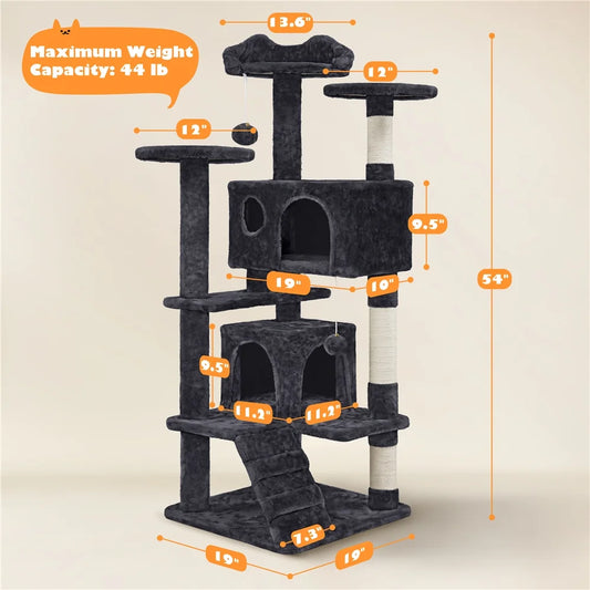 54''H Cat Tree Condo with Scratching Post Tower, Black